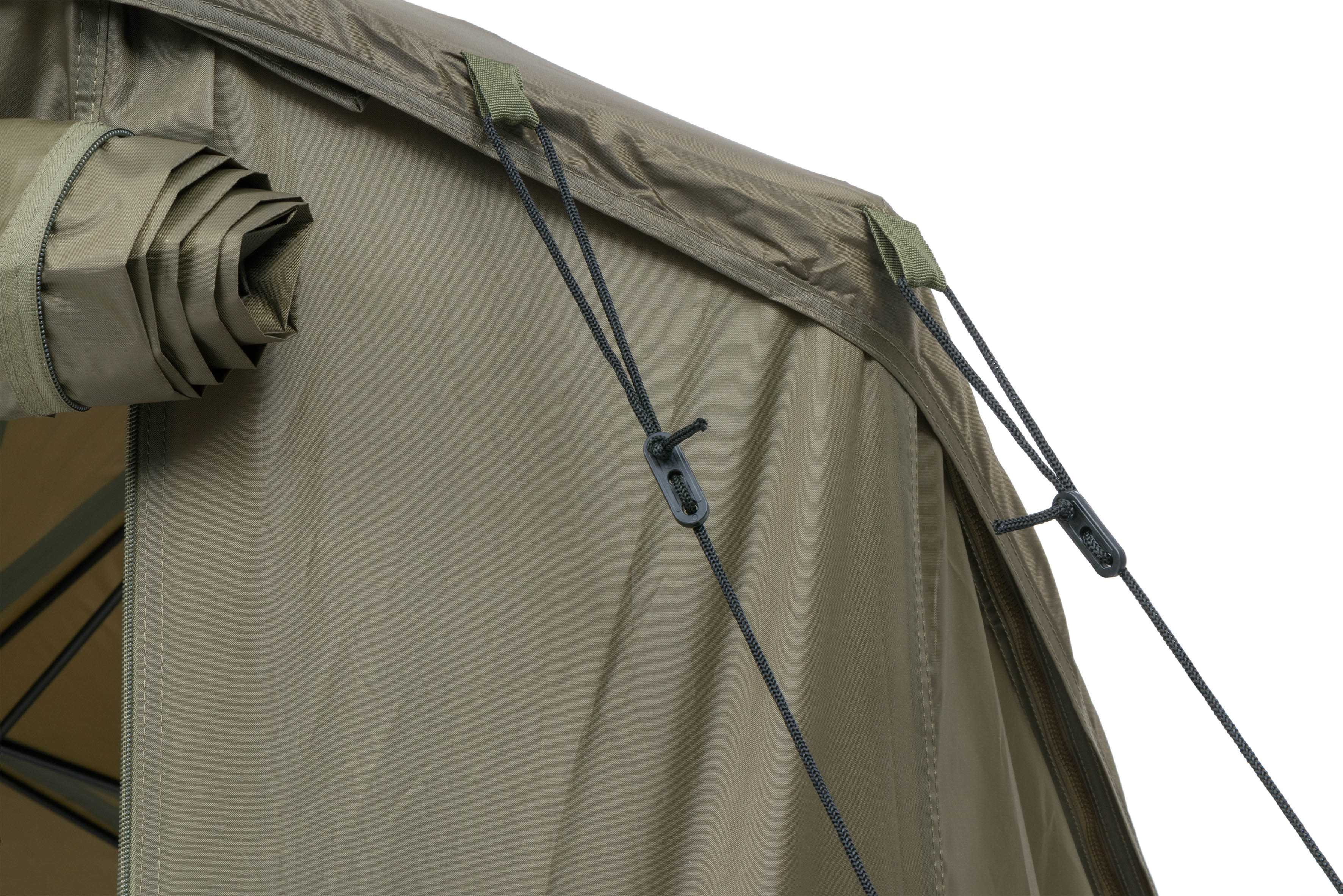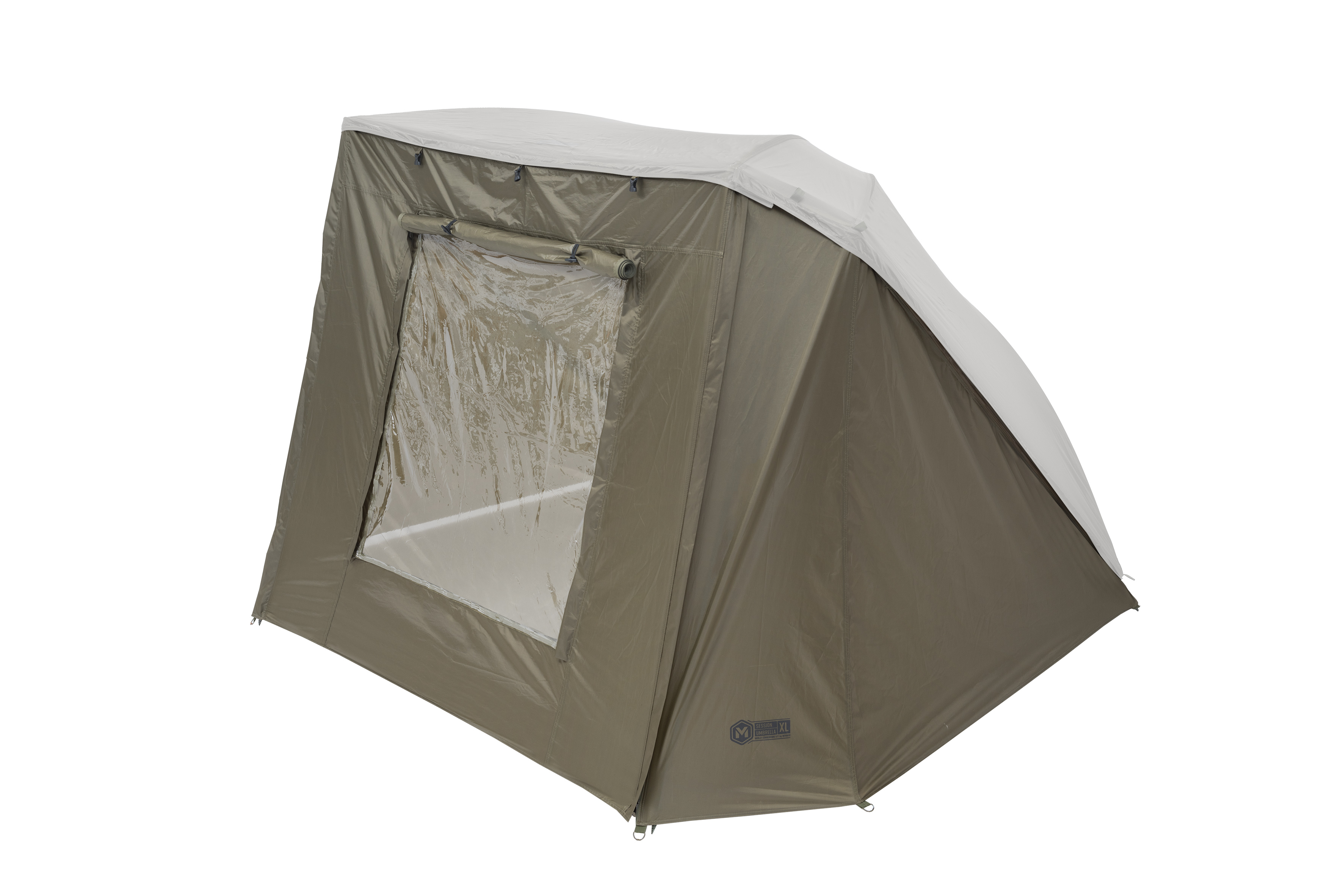 Jeho konstrukce zároveň umožňuje extrémně rychlé rozložení a složení. Díky rovné zadní stěně, svislým bočnicím i plochému přednímu panelu nabízí skvěle využitelný vnitřní prostor obdélníkového tvaru. Téměř celá přední stěna je tvořena otevíratelným dveřním panelem, vybaveným obrovským oknem se třemi vrstvami (nylonový plášť / PVC okno / moskytiéra). Čtveřice bouřkových tyčí je dostupná v samostatné stabilizační sadě, sloužící rovněž pro postavení základního deštníku s bočnicí na čtyřech stojnách bez středové tyče. Bouřkové tyče jsou rovněž dostupné samostatně v balení po dvou kusech. Ke kotvení brolly se využívají masivní bivakové kolíky, které jsou součástí základního deštníku.