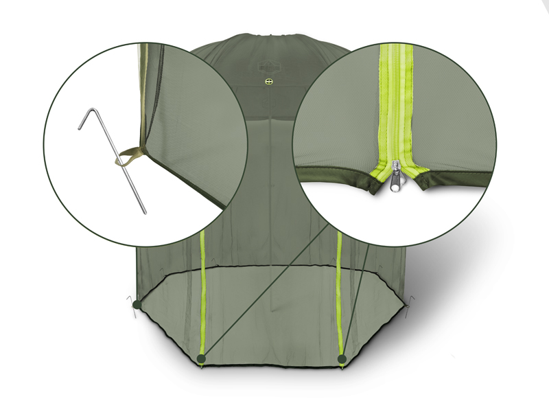 Systém uchycení spočívá centrálním otvorem pro špic deštníku a v 8 kolících, které jsou součástí balení. Vchod jsme vybavili dvěma zipy reflexní barvy, abychom umožnili snazší orientaci v noci a při nepříznivých světelných podmínkách. Jemná síťovina nepustí k Vašemu tělu ani jednoho nechtěného společníka.