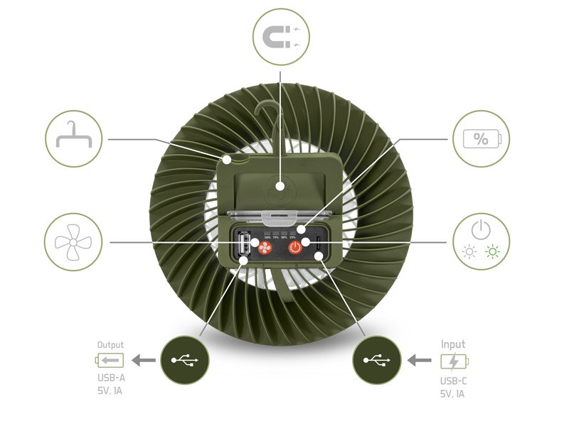 Stejně jako osvětlení, i ventilátor nabízí tři režimy intenzity, díky čemuž si jej jednoduše přizpůsobíte podle aktuálních teplotních podmínek. Prvním stisknutím se spustí ventilátor na nízkou intenzitu, při které baterie vydrží až 19 hodin. Druhý stisk zvýší výkon ventilátoru, přičemž výdrž se zkrátí na přibližně 14 hodin. Při nejvyšší intenzitě, aktivované třetím stiskem, ventilátor vydrží pracovat přibližně 11 hodin.
