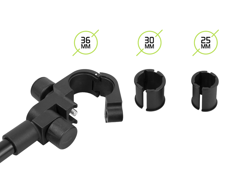Disponuje univerzálním závitem kompatibilním s většinou standardně vyráběných držáků prutů. Úchyt ramene poskytuje díky plastovým redukcím variabilní průměr 25, 30 nebo 36 mm, takže ideálně sedne na většinu křesel dostupných na trhu. Kloubový mechanismus s otočným regulátorem umožňuje nastavení ramene v různých polohách podle toho, zda chcete lovit se špičkou při hladině nebo co nejvýše nad vodou.
