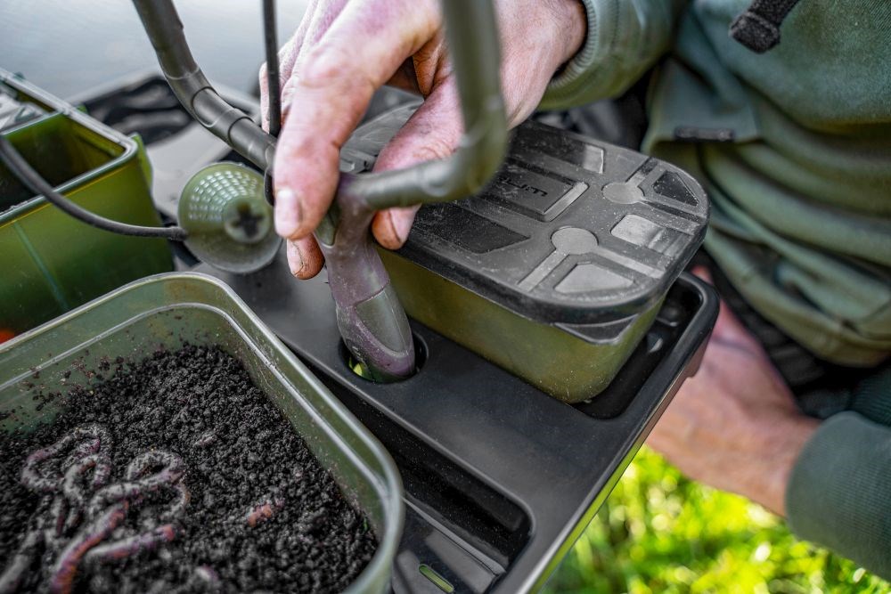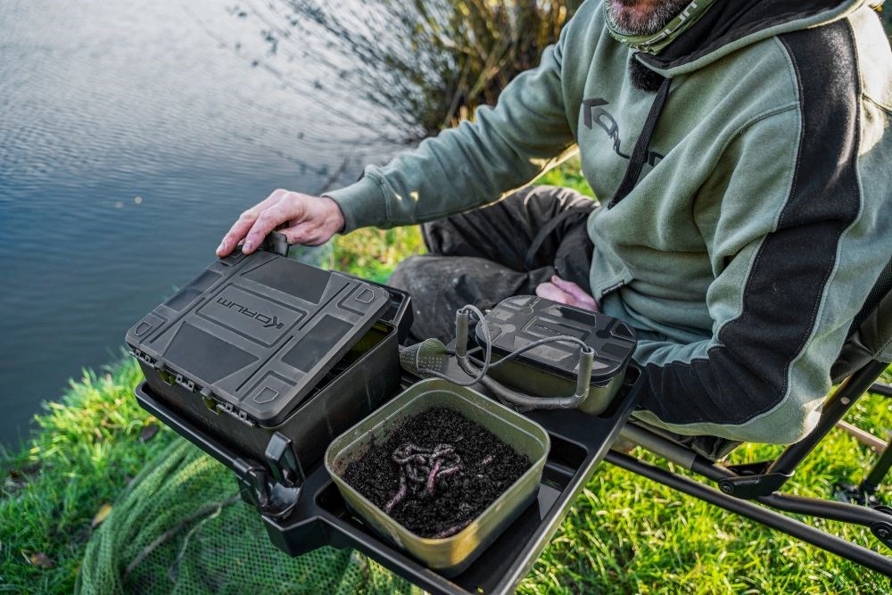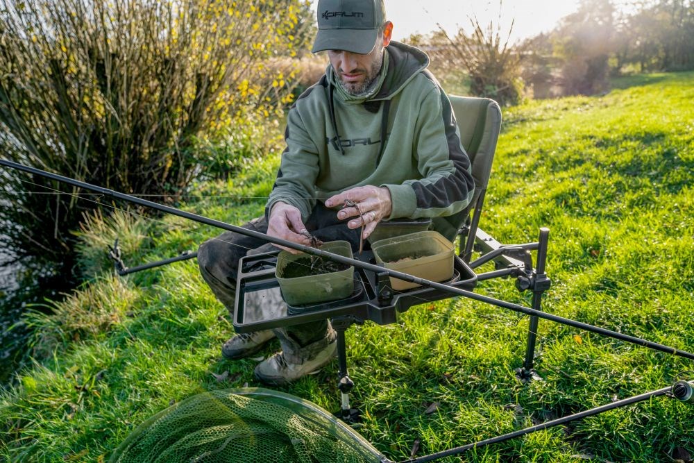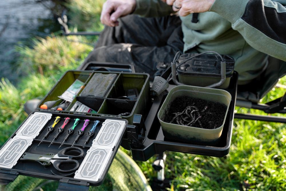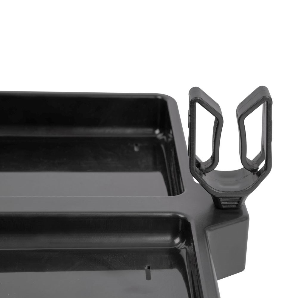 Boční plato Allrounder Side Tray je nabité funkcemi. Má prohlubně velikosti pro krabičky BLOX a Bait Tub, držák na pití, otvor pro prak a vestavěný stojan na návazce.