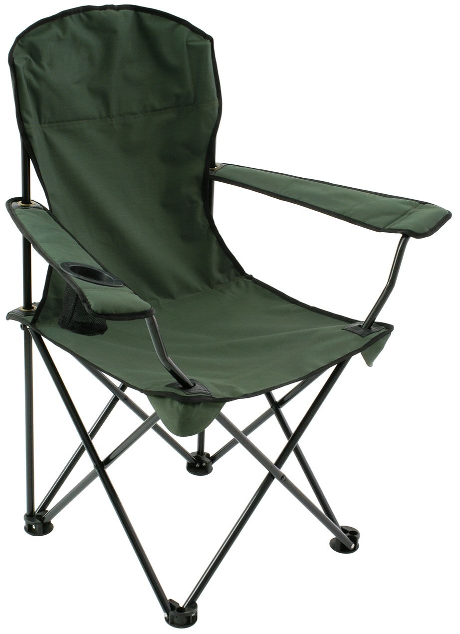 Velká, pohodlná rybářská křesla z odolné vodotěsné látky v zelené a maskovací barvě.