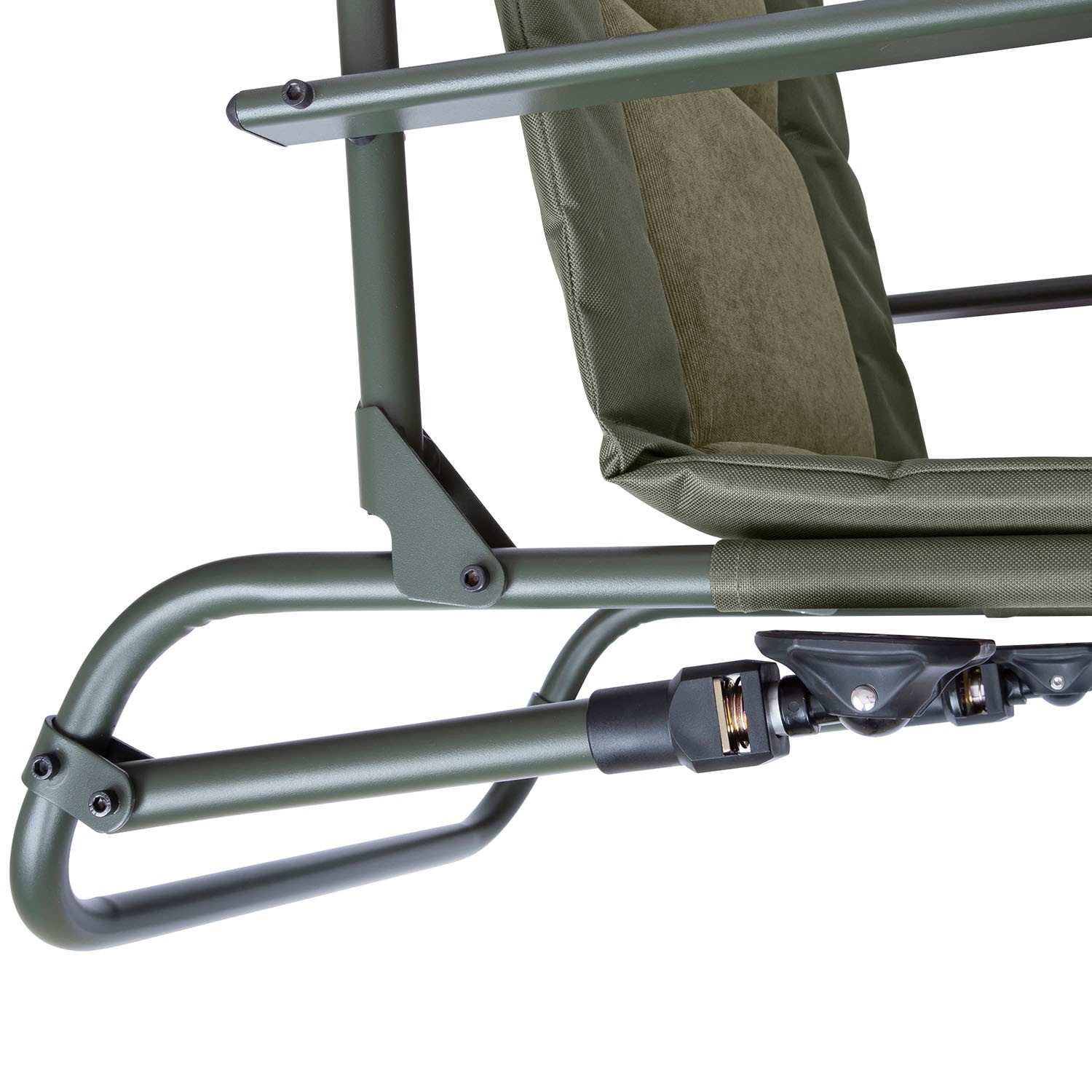 Je vyrobeno z nového odolného, ale měkkého materiálu Velvotex™ pro ještě větší pohodlí. Nohy mají pružinový systém nastavení výšky s širokými patkami proti zaboření do bláta. Zadní nohy lze složit a položit křeslo na bok lehátka. Mají také uzamykací držáky, které zajišťují pohodlné a bezpečné sezení.