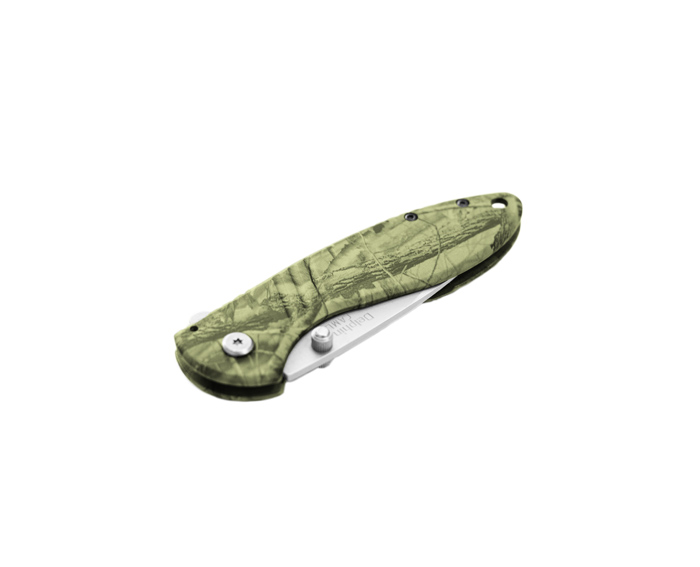 Rukojeť má pěknou "lesní" kamufláž, 8,5cm matná čepel je fixována zavíracím mechanismem typu "liner lock" – je uzamčena vyosenou částí rukojeti. Čepel ve tvaru "spear point" (kopí) je možné z rukojeti vysunout rychlým systémem – zatlačením za výstupek. Má klip, který si zavěsíte např. za kapsu kalhot a nůž je tak chráněn proti nechtěnému vypadnutí.