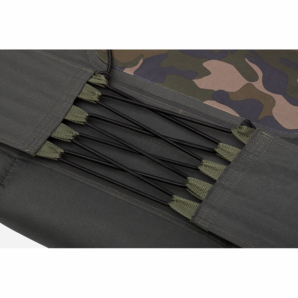 Matrace je z decentně zeleného voděodolného materiálu 600D, zatímco okraje jsou ve stylovém camo vzoru Avenger. Systém skládacího plochého rámu s dvojitým sklopením je velice kompaktní pro snadný transport a umožňuje ponechání většiny spacáků na lehátku při balení. Všechny nohy jsou plně nastavitelné a osazené otočnými patkami proti zaboření.