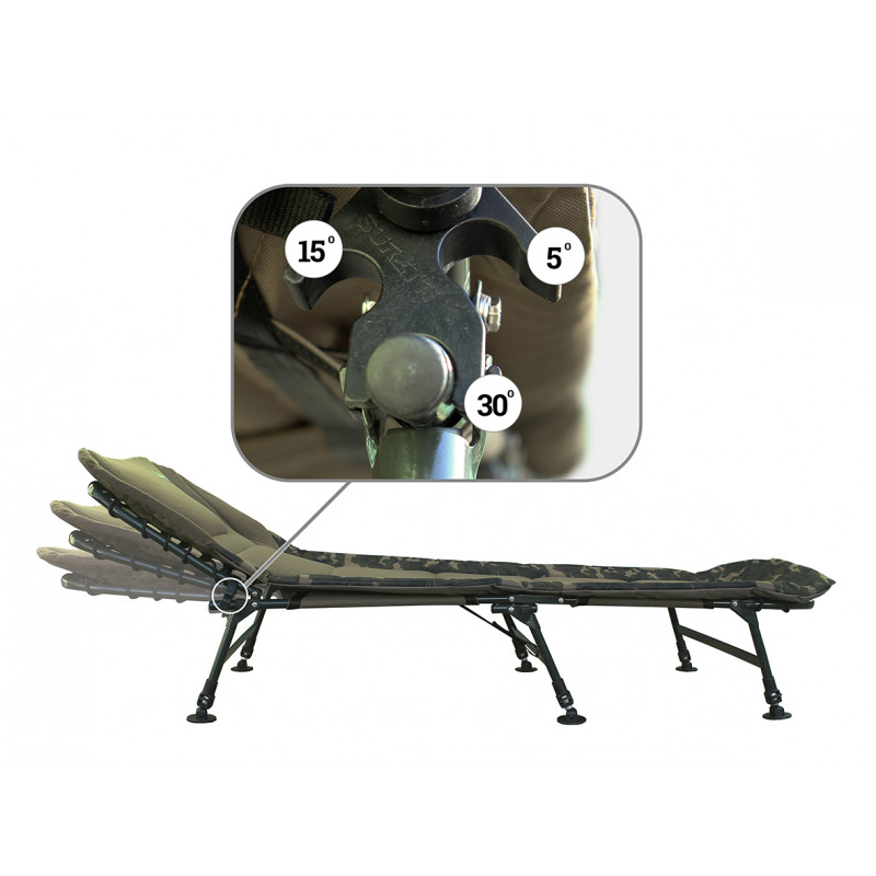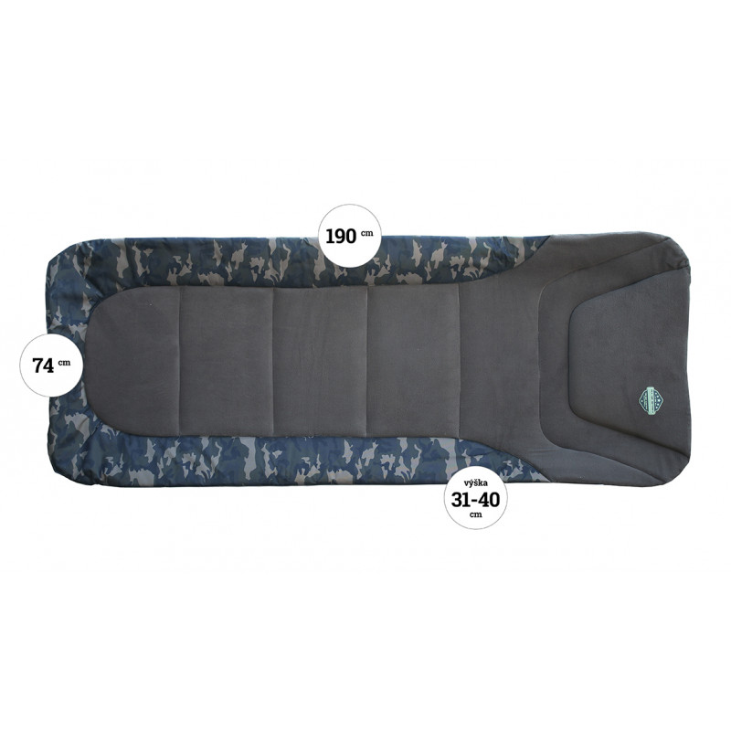 Unikátní rozložení tří párů noh umožňuje sezení po celé jeho délce. Nohy mají aretaci proti sklopení. Střed matrace je z mikro fleece, po obvodě Camo 600D Oxford a to celé vyplněno termoizolační pěnou. Matrace s polštářem je na konstrukci v prostřední části vyztužena pro větší pohodlí. Therapy Camo má navíc unikátní patentovaný polohovací adaptér na nastavení podhlavníku ve třech úrovních.