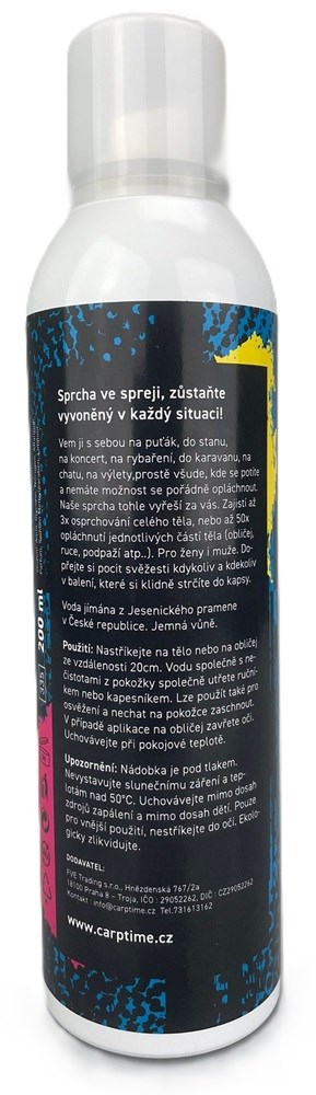 Sprcha ve spreji, zůstaňte vyvoněný v každý situaci! Vem ji s sebou na puťák, do stanu, na koncert, na rybaření, do karavanu, na chatu, na výlety, prostě všude, kde se potíte a nemáte možnost se pořádně opláchnout.