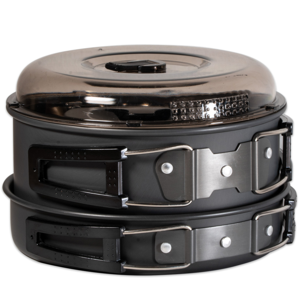 Campingová kuchyňská sada, která obsahuje konvičku, pánev a hrnec s pokličkou. Vše je vyrobeno z lehkého, eloxovaného hliníku a pro snadný transport vše pasuje do sebe.