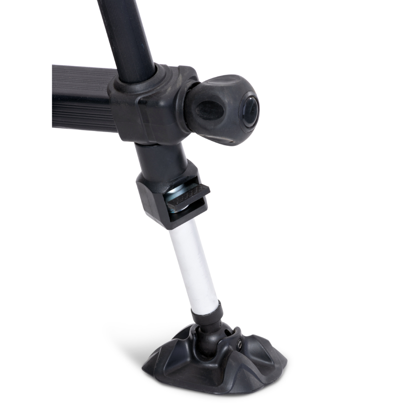 Aby stupačka nevyklouzla, jsou součástí balení dvě zajišťovací destičky, příslušné šrouby a nástroje pro upevnění destiček. Po vložení podnožky se tyto destičky jednoduše přišroubují na určená místa. Vše je tedy zajištěno proti nechtěnému vyklouznutí. Nožní plošina je vybavena dvěma přídavnými tyčemi (průměr 25 mm), které lze samozřejmě nastavit pomocí upínacích zařízení. Nohy jsou také plynule vysouvací a mají patky proti zapadnutí do bláta a lze na ně umístit další příslušenství. Kompletně vyrobeno z korozivzdorného hliníku.