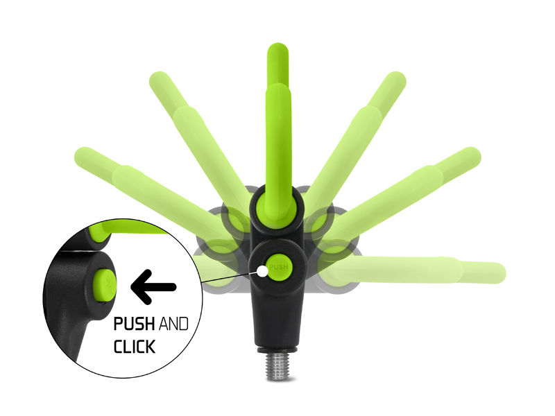 Díky důmyslnému systému tlačítka ve spodní části, lze tento držák polohovat a následně polohu zajistit. Šířka ramen je 17cm. Držák je osazen univerzálním závitem a je kompatibilní s většinou vidliček a stojanů dostupných na trhu. Barevná zeleno-černá kombinace dokonale doplňuje feederovou řadu REAXE.