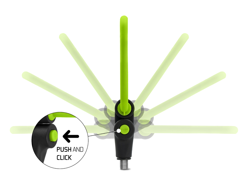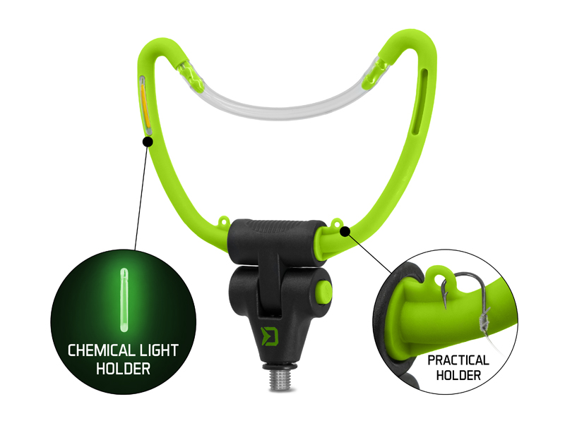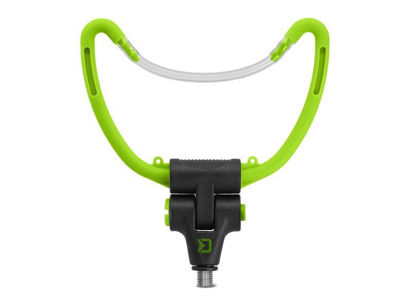 Díky důmyslnému systému tlačítka ve spodní části, lze tento držák polohovat a následně polohu zajistit. Šířka ramen je 14,5cm. Užitečným doplňkem držáku jsou očka pro uchycení háčku, do kterých můžete zachytit háček například při plnění feederového košíku. Držák má na těle umístěny 4 otvory na chemické světlo, což oceníte zejména při nočním rybolovu. Držák je osazen univerzálním závitem a je kompatibilní s většinou vidliček a stojanů dostupných na trhu. Barevná zeleno-černá kombinace dokonale doplňuje feederovou řadu REAXE.