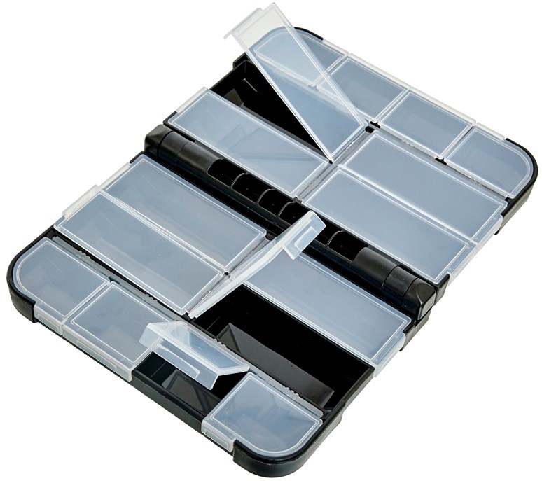 Kompaktní krabička s celkově 16 samostatně uzavíratelnými přihrádkami na drobnosti a menší nástrahy.