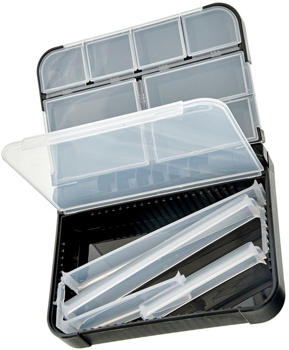 Kompaktní krabička s celkově 8+1 samostatně uzavíratelnými přihrádkami na drobnosti a menší nástrahy.