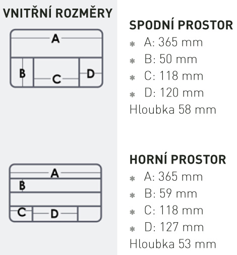 Kryt je z velmi houževnatého a odolného materiálu a zámky z ABS. Mikrožebrování vám dovolí využít každý kousek prostoru. Přepážky mohou být přenastaveny do mnoha různých variant, 5+12 variabilních přepážek.