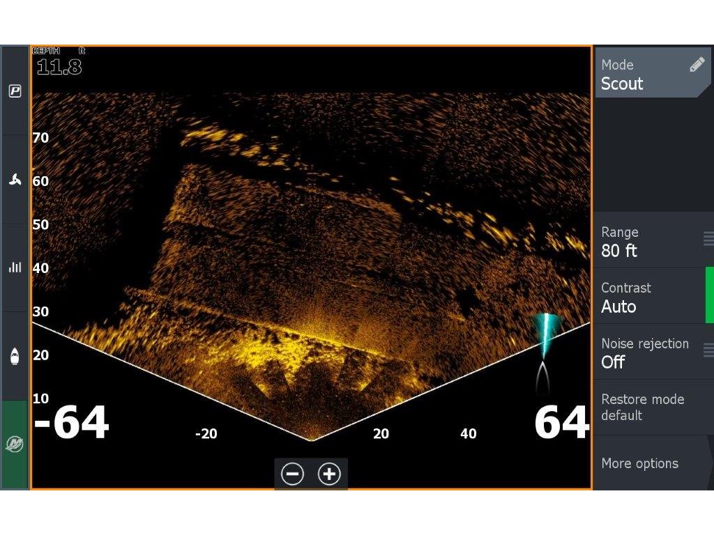Zobrazuje struktury a rybí cíle, které se nacházejí před sondou.