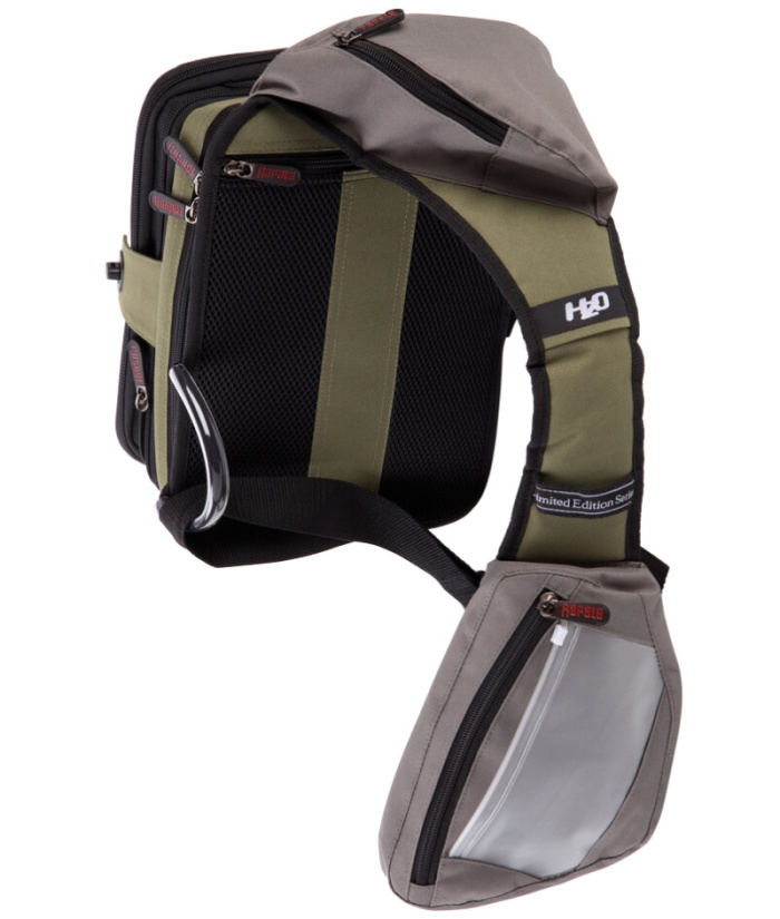Na vypolstrovaném ramenním popruhu: vytahovací šňůrka k upevnění rybářské pomůcky, D-kroužek, vzadu kapsa na zip a na přední straně kapsa pro kleště.