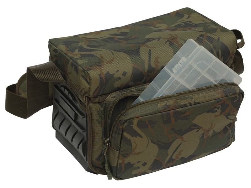 Vláčecí taška střední velikosti, která obsahuje tři větší a dvě menší krabičky na nástrahy.