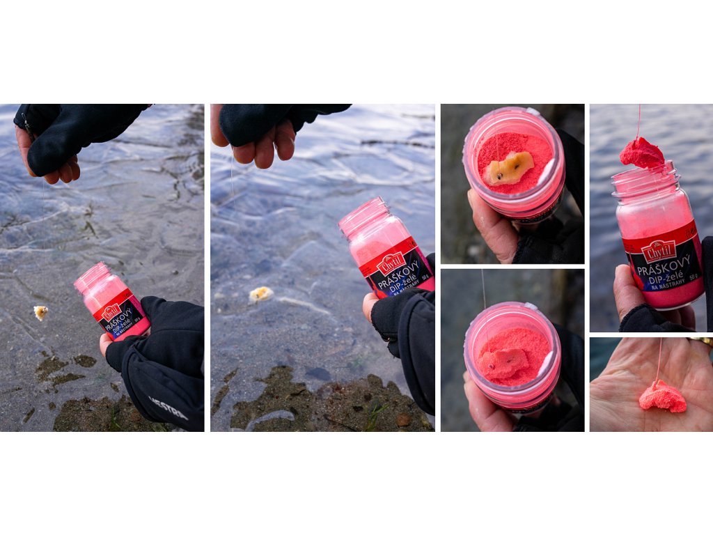 Stačí namočit jakoukoliv nástrahu do vody, následně obalit v dipu a hned se může nahazovat. Následně se ve vodě vytvoří velmi atraktivní sliz, který se postupně omývá a láká rybu k nástraze. Několik příchutí.