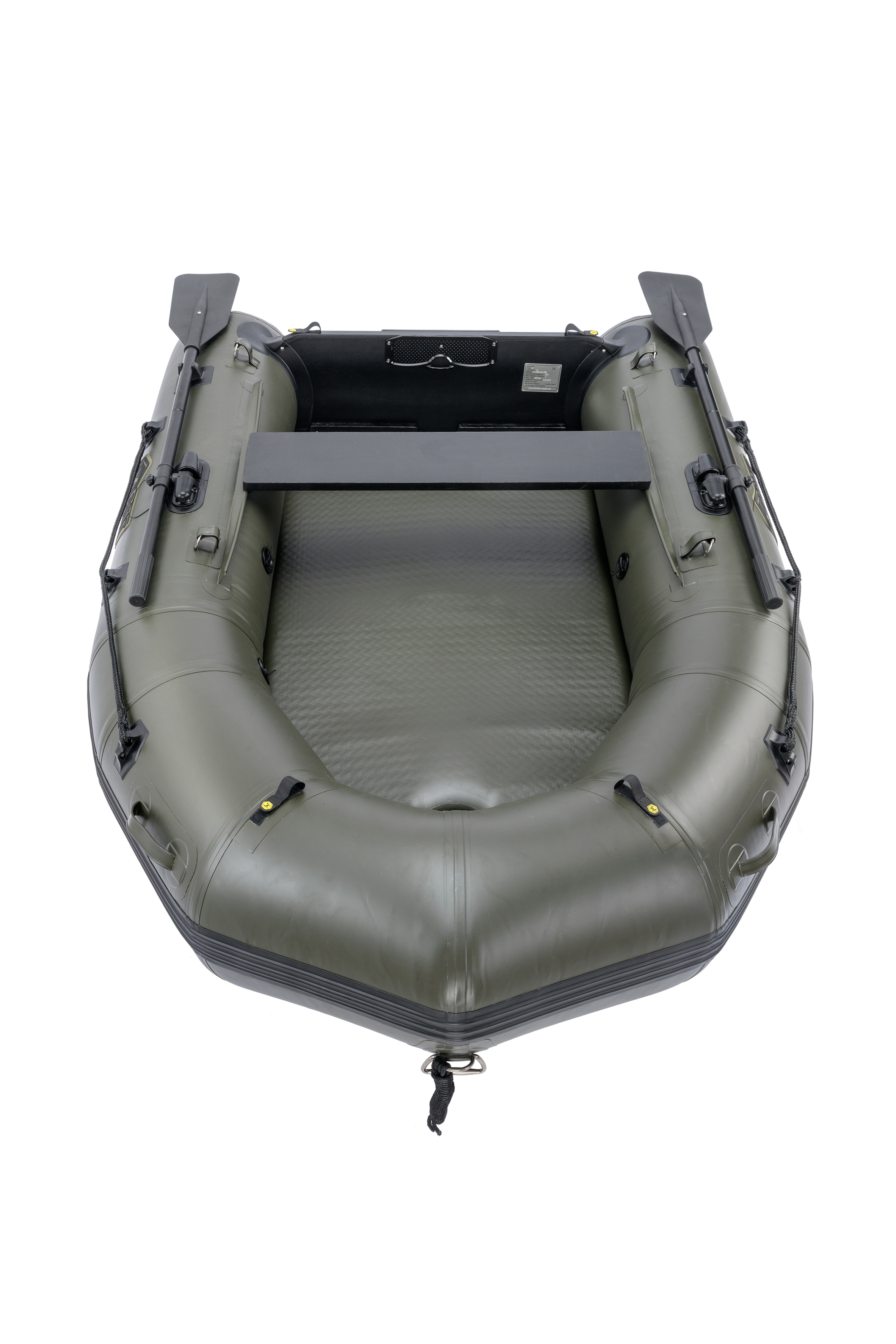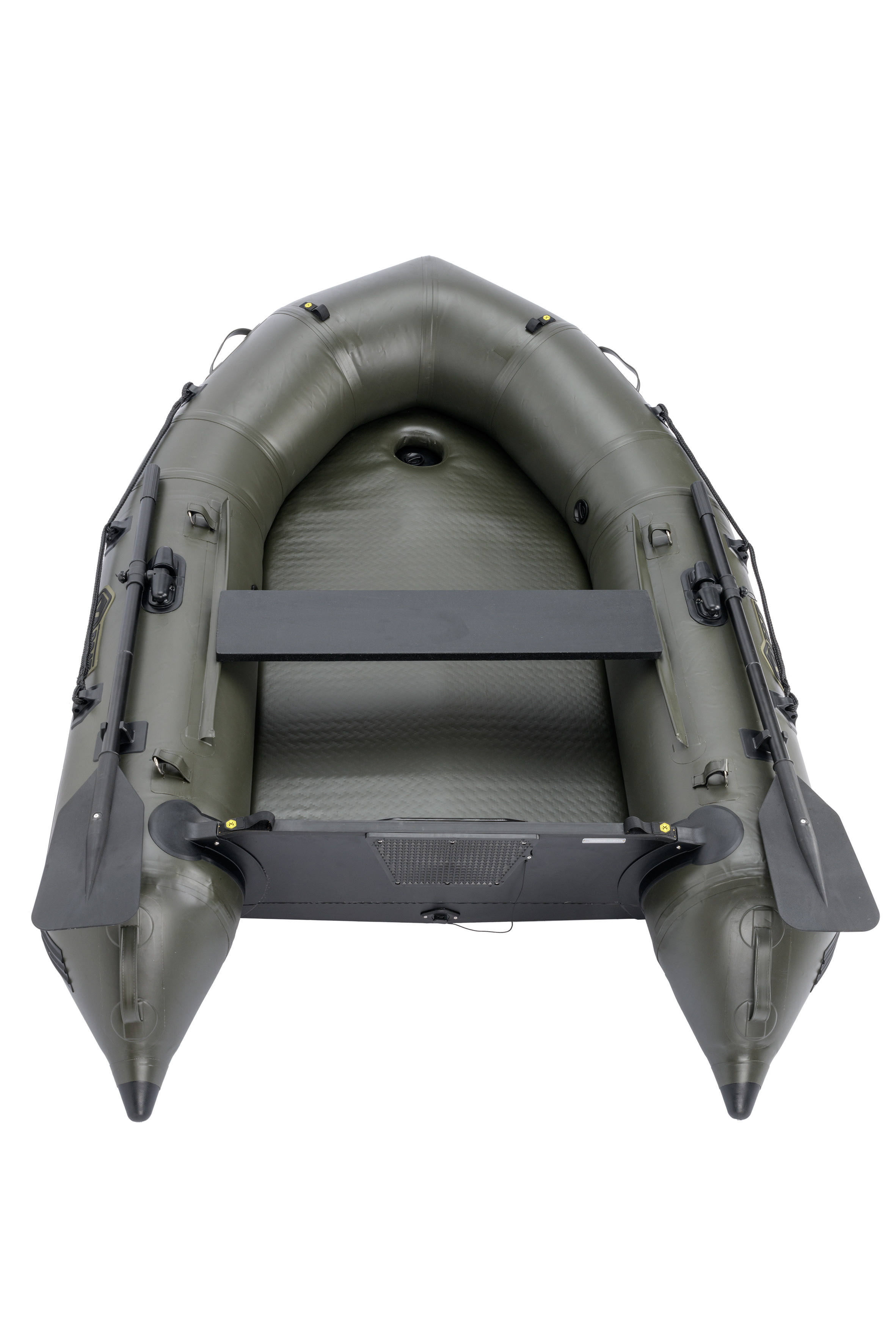 Nadstandardní šířka a specifický tvar člunu zajišťují extrémně velký vnitřní prostor. Ten je vždy výrazně větší než u běžných člunů stejné délky na trhu. Tomu napomáhá i specifické řešení zadní části plováků, které dovoluje umístit zrcadlo co nejblíže ke konci plováků a zároveň zachovat jejich funkci při udržování směru jízdy. Výrazně zdvihnutá příď spolu se speciálním tvarováním přední části, mohutným nafukovacím kýlem v celé délce podlahy a speciálně tvarovaným zrcadlem zajišťují vynikající hydrodynamické vlastnosti člunu a směrovou stabilitu. To v praxi znamená vyšší rychlost , snadnější ovládání a nižší spotřebu energie při pohonu člunu. Zesílený materiál plováků zvyšuje odolnost proti proražení. Nafukovací podlaha se zdvojenou nášlapnou vrstvou je téměř nezničitelná a její zelená barva skvěle ladí s se zbarvením člunu i černými vesly a ostatními doplňky. Každý člun je vybaven řadou upínacích pásků na suchý zip v přední části i na zrcadle. Najdeme zde i masivní upínací popruh na příslušenství ve střední části.