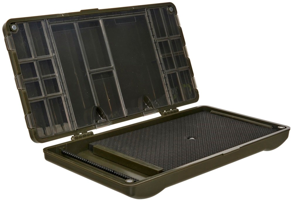 Jedna strana obsahuje samostatně uzavíratelné přihrádky na drobnosti a bižuterii (20x). Polepy na přihrádky pro snadnou organizaci. Na druhé straně je neoprenový panel pro uchycení návazců, hrazda pro zachycení háčků, aby nedocházelo k poškození hrotů háčků. Součástí balení jsou i připínáčky na uchycení návazců.