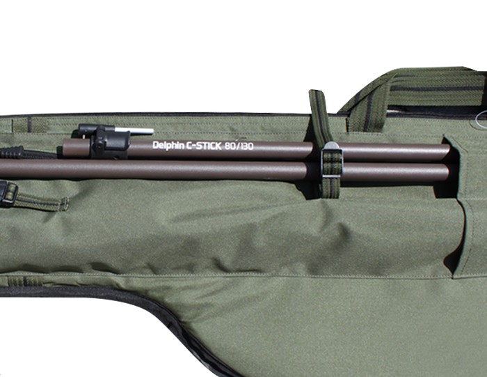 Obě vnitřní komory na pruty jsou fixovatelné pomocí suchého zipu na jejich vrchu. Při navrhování pouzder jsme mysleli na uložení největších navijáků a dovolíme si tvrdit, že je sem možné uložit 99,9% běžně používaných kaprařských sestav, včetně těch, s očky velikosti 50mm! Model má po straně extra dlouhou kapsu se zipem, které slouží například pro transport rybářského podběráku. Na něm jsou našity uložení na vidličky i se stahovací páskou. Toto pouzdro tak pojme většinu těžko skladného rybářského náčiní. Celý materiál pouzdra je vyroben z odolné látky, která bez problémů odolá běžnému dešti. Spodní část pouzdra je navíc chráněna odolným, nepromokavým materiálem, což umožňuje položení této části pouzdra i na mokrou zem, či dokonce do louže. Lehké zipy s kovovým běžcem, komfortní rukojeť a pás pro zavěšení pouzdra na rameno dotvářejí vysoce praktické využití tohoto pouzdra.