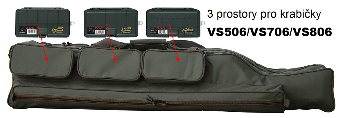 Na jedné straně je dlouhá kapsa o rozměru 89x9x5 cm na podběrák a nad ní jsou kapsy 20x10x5 cm na drobnosti, nebo na krabičky Versus typu VS506, VS706 a VS806. Na druhé straně jsou kapsy o rozměru 20x20x5cm do kterých pasují krabičky typu VS3010NDM.