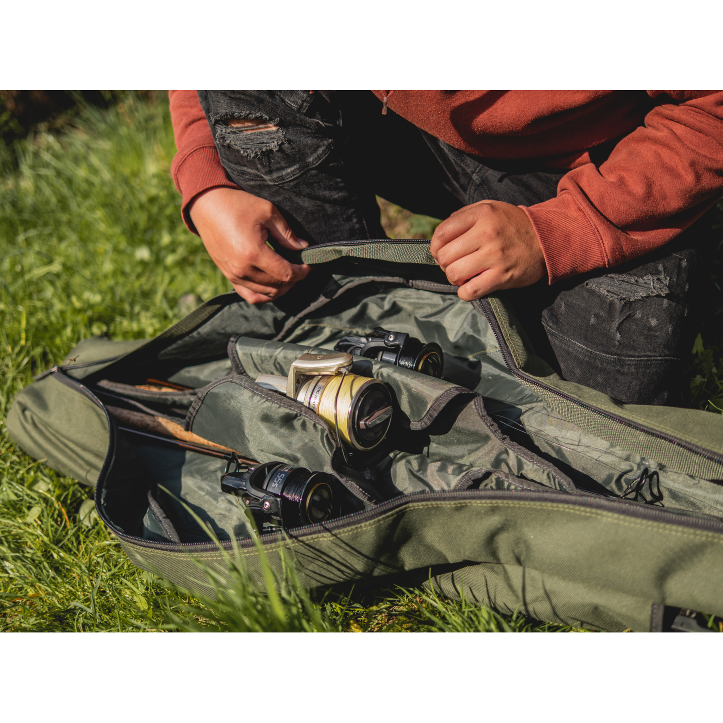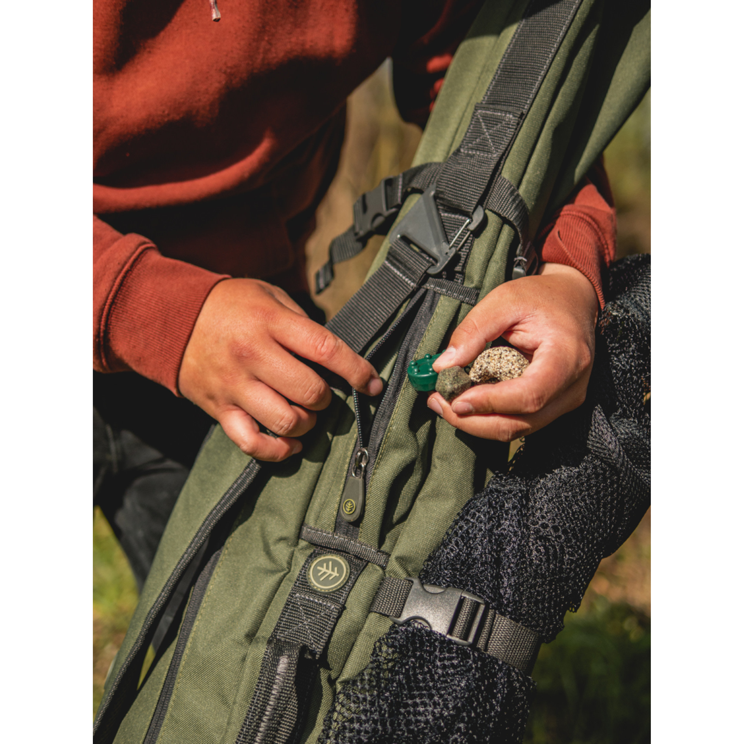 Po stranách nalezneme boční kapsy pro další pruty nebo jiné doplňky jako jsou podběráky apod.