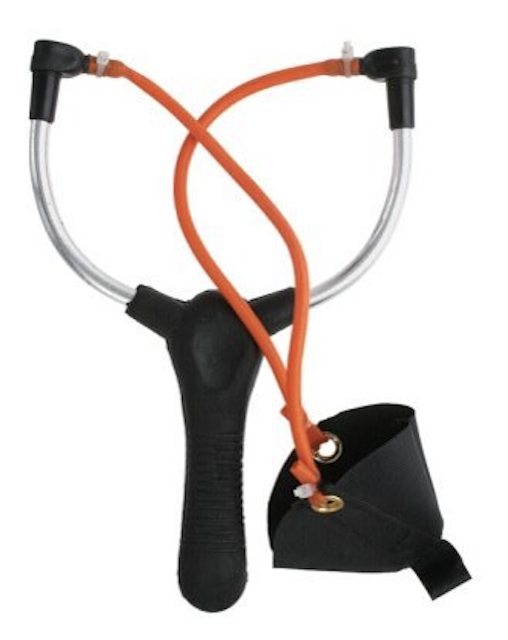 Pevný rybářský prak vybavený kovovým rámem a pevnými gumami zajišťujícími dlouhý dostřel.