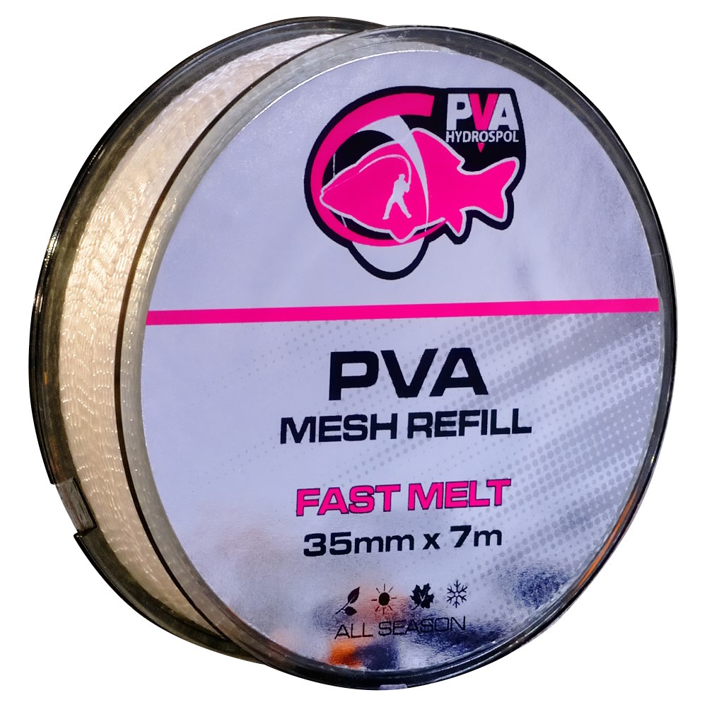 PVA náhrady jsou vhodné k doplnění punčochy na prázdný tubus. Jak název napovídá jedná se o rychlorozpustnou verzi punčochy. Jako výrobci PVA produktů jsme usilovně pracovali na variantě punčoch, která zvládne plnit hned několik vlastností najednou. Pro výrobu nové punčochy jsme opět zvolili kvalitní japonská vlákna, která mají poloviční čas rozpadu oproti vláknům v naší klasické verzi. Zakládáme si na kvalitě, ale i stylu pletení punčoch, naši zákazníci se mohou znovu těšit na hustý micro-mesh, do kterého lze plnit drobné krmeni, sypké materiály a použít ji tak může opravdu každý rybář. Díky zvolenému úpletu můžete PVA punčochy Fast melt používat dokonce i v teplých vodách. To z ní dělá skvělou punčochu pro celoroční použití.