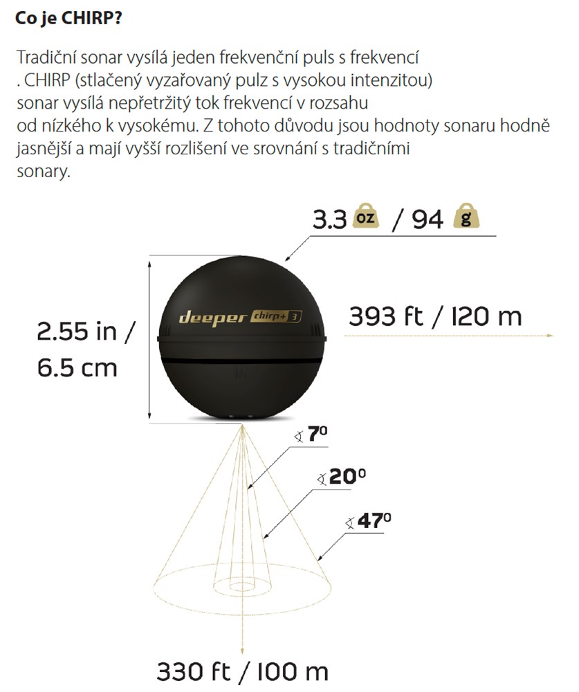 CHIRP+ 3 se vyznačuje třemi frekvencemi paprsku, což vám umožní přizpůsobit vaši rybářskou strategii. Použijte široký paprsek (47°) pro rychlé skenování oblasti, střední paprsek (20°) pro vyvážené detaily nebo úzký paprsek (7°) pro přesnou přesnost konstrukce a ryb.