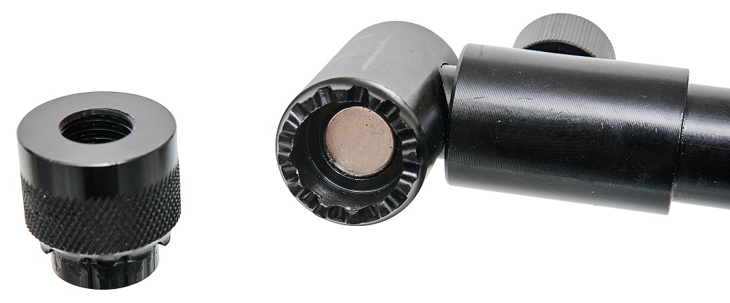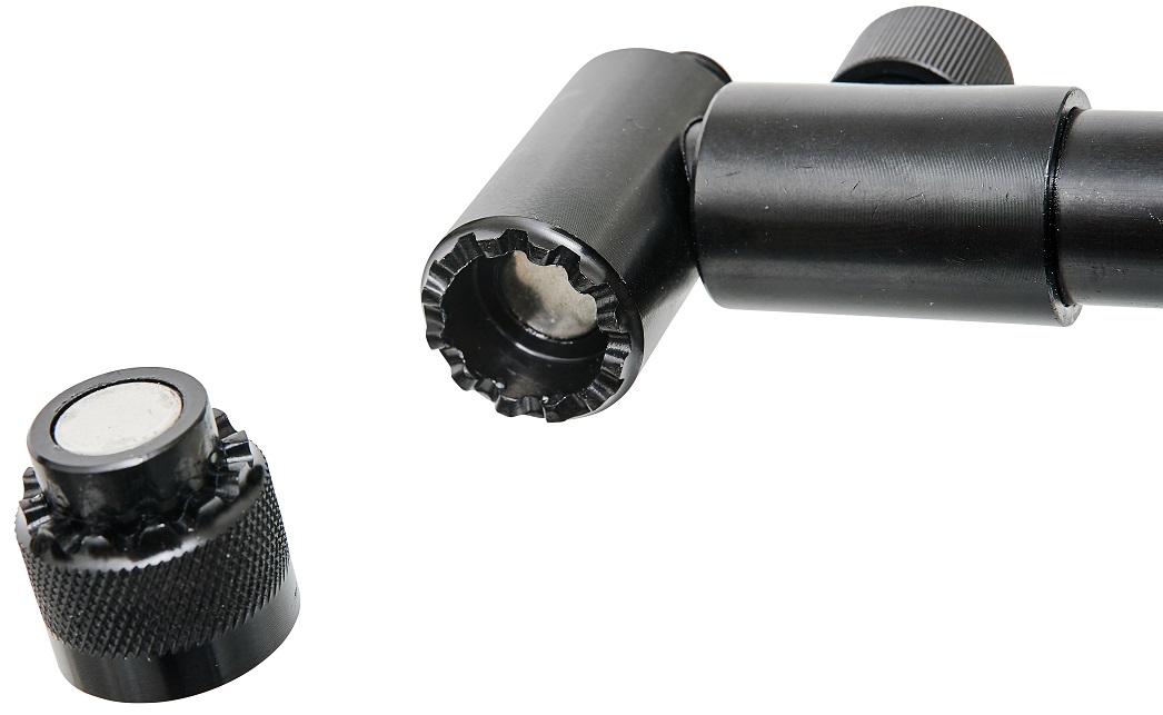 Velká pojistná matice, kterou nelze ztratit, pro pohodlnou aretaci. Pevný a odolný materiál. Horní univerzální závit na signalizátory, držák prutu atd. je umístěn na pevném magnetu.