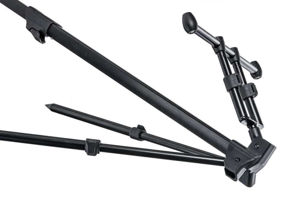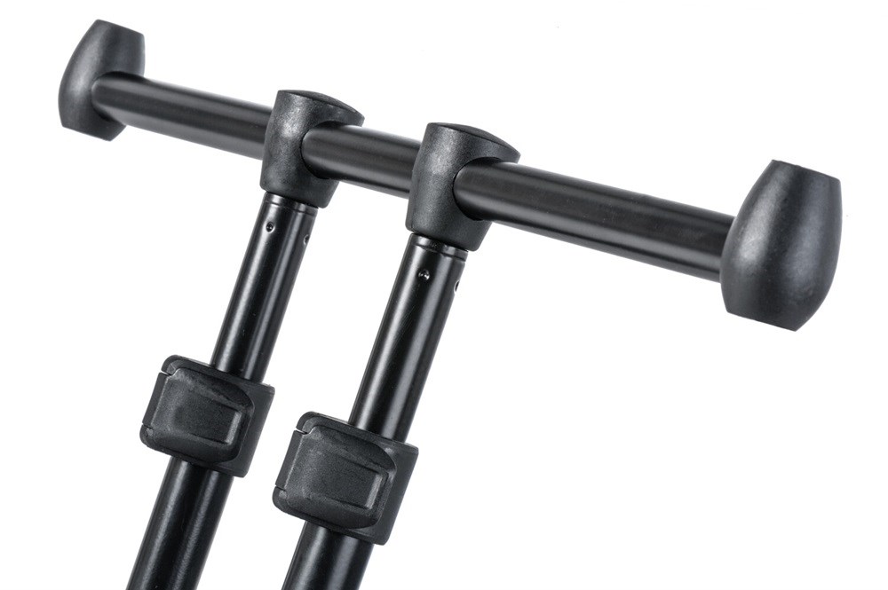 Nepotřebujete žádné šrouby. Rozložení všech částí, nastavení délky či vyklopení teleskopických noh je otázkou několika vteřin. Vše je řešeno unikátním systémem na zacvaknutí. Stojan je vybaven hrazdami na dva pruty s nastavitelnou výškou. Nastavit můžete i délku stojanu a samozřejmě i délku teleskopických noh. Stojan je ideální pro lov s krátkými stalkerovými pruty. V případě potřeby je možné stojan osadit hrazdami na tři pruty, dostupnými samostatně.