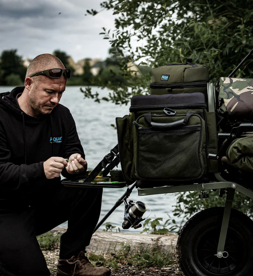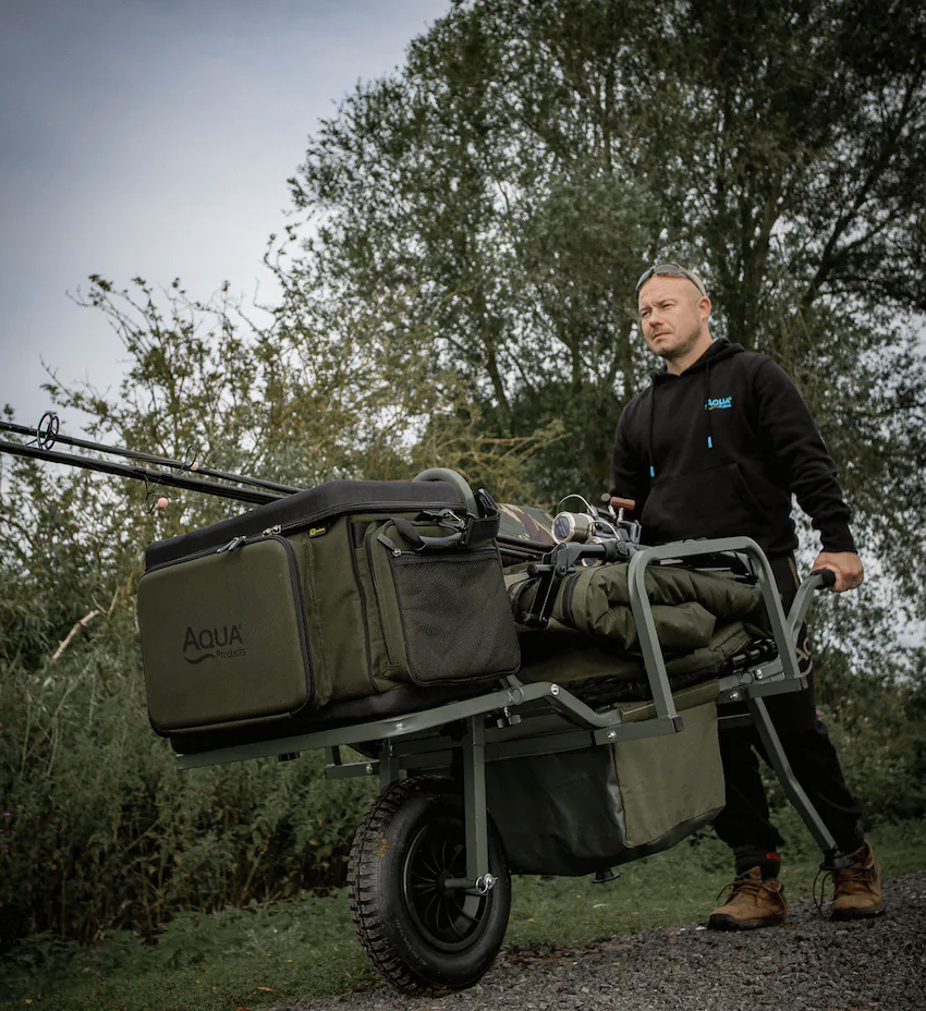 Taška na transportní vozíky od společnosti Aqua – Front Barrow Bag Black Series. Byla navržena tak, aby pasovala na většinu vozíků na trhu.