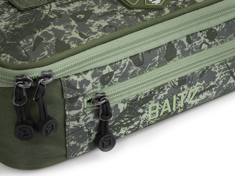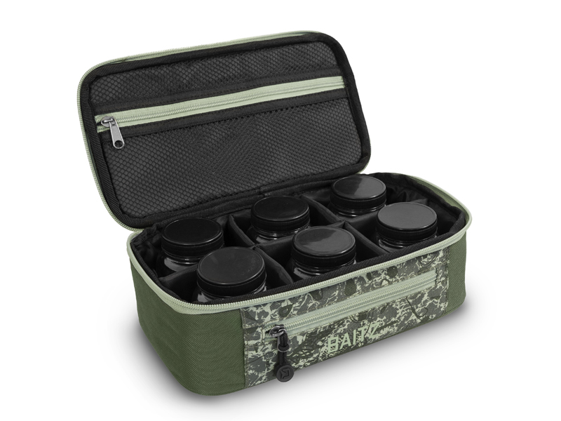 BAITZ je kompaktní taška, speciálně navržená pro uskladnění a přenos dipovaných nástrah. V základu obsahuje 6 kusů transparentních plastových dóz s víkem a těsněním. Díky těsnění můžete do dóz bez obav uskladnit nadipované boilies, pelety či jiné nástrahy. Uvnitř tašky se nacházejí přepážky, které vytvářejí šest stejných individuálních přihrádek. Právě v těchto přihrádkách budou dózy s nástrahami vždy dokonale organizovány a připraveny k použití.