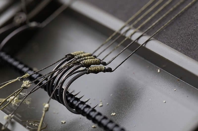 Každý háček hotového návazce se přichycuje na robustní hliníkovou hrazdičku, pod kterou je vybraný prostor, díky kterému nehrozí poškození ostří háčku.
