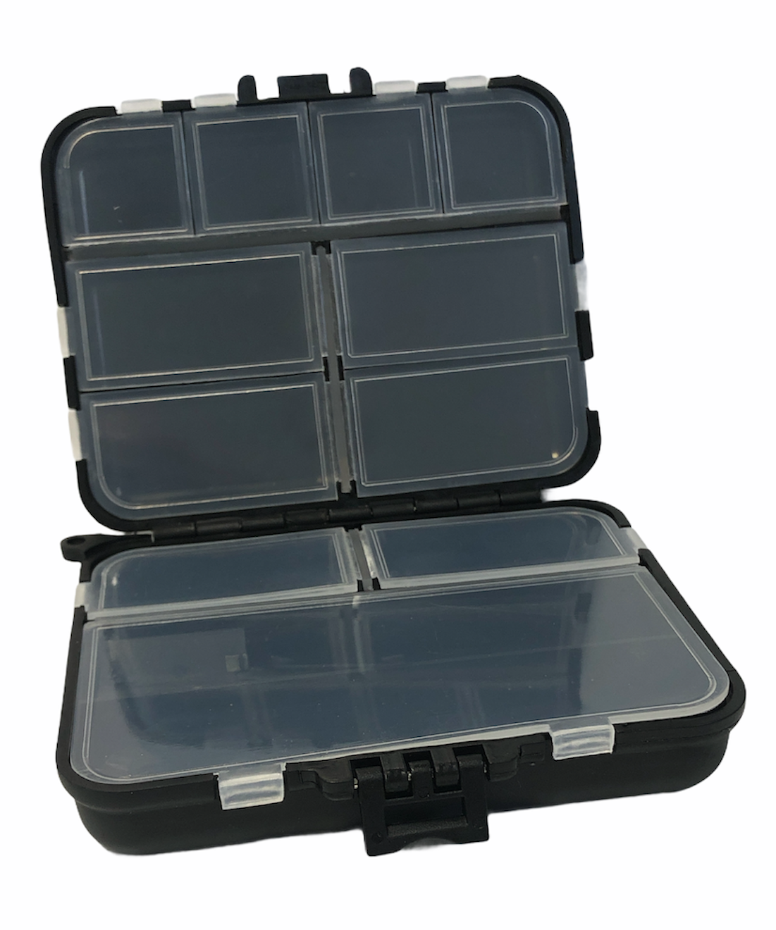 Černá plastová krabička s nastavitelnými přihrádkami na rybářské háčky, obratlíky, gumové zarážky a další rybářské drobnosti.
