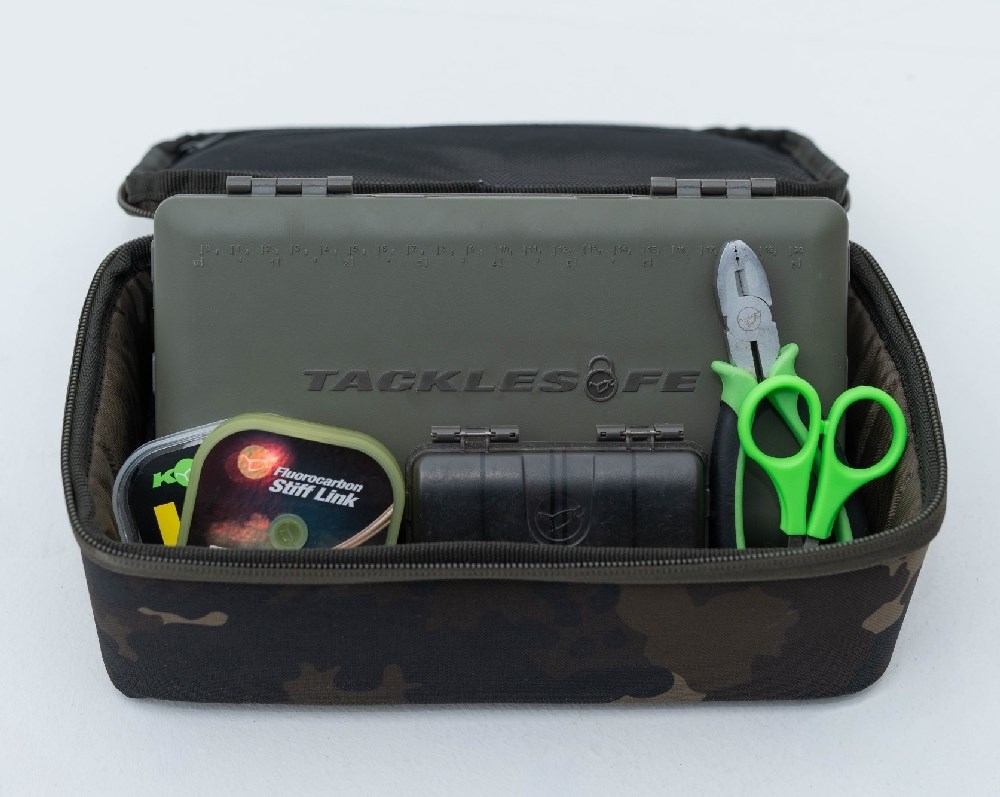 Tackle Pouch 140 je dostatečně prostorné pouzdro, do kterého se pohodlně vejde Korda Tackle Safe, a zároveň je kompatibilní s velkou peněženkou Compac Wallet. Tyto peněženky jsou dostupné ve třech velikostech (Small, Medium a Large) a pasují do pouzder 100, 125 a 140, čímž poskytují ještě větší flexibilitu při organizaci vybavení.
