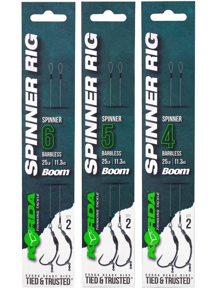 Návazec Ready Tied Spinner Rig obsahuje 5,5” Boom sekci a nyní přichází se třemi typy háčků; Krank, Kurv Shank a nejnovější verze ve stáji Korda, Spinner Hook. Všechny jsou dostupné ve verzích s protihrotem nebo bez protihrotu, velikosti 4 až 6.