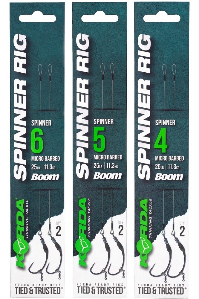 Návazec Ready Tied Spinner Rig obsahuje 5,5” Boom sekci a nyní přichází se třemi typy háčků; Krank, Kurv Shank a nejnovější verze ve stáji Korda, Spinner Hook. Všechny jsou dostupné ve verzích s protihrotem nebo bez protihrotu, velikosti 4 až 6.