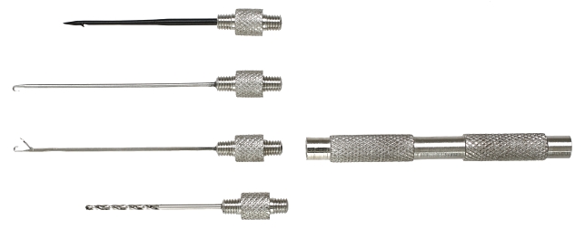 Kovová sada 3 druhů jehel a 1 vrtáček, skvělý set pro každého kapraře. Vše v top kvalitě, originální doplněk rybářské výbavy, určený nejen pro profesionály!