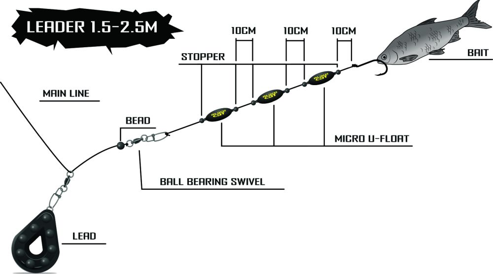 Nástraha je s pomocí podvodních splávků Micro U-Floats prezentována těsně nade dnem a podle velikosti nástrahy samotné lze zafixovat na návazci vícero podvodních splávků Micro U-Floats za sebou, které se postarají o vyšší vzlínání při minimálních vibracích na návazci.