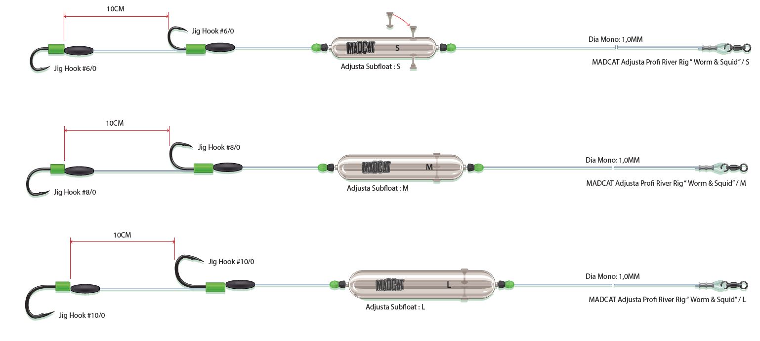 Montáže s podvodním splávkem MADCAT® Adjusta Subfloat pro rybaření pro rybaření s žížalami a nebo olihněmi na dně rychle tekoucích řek.