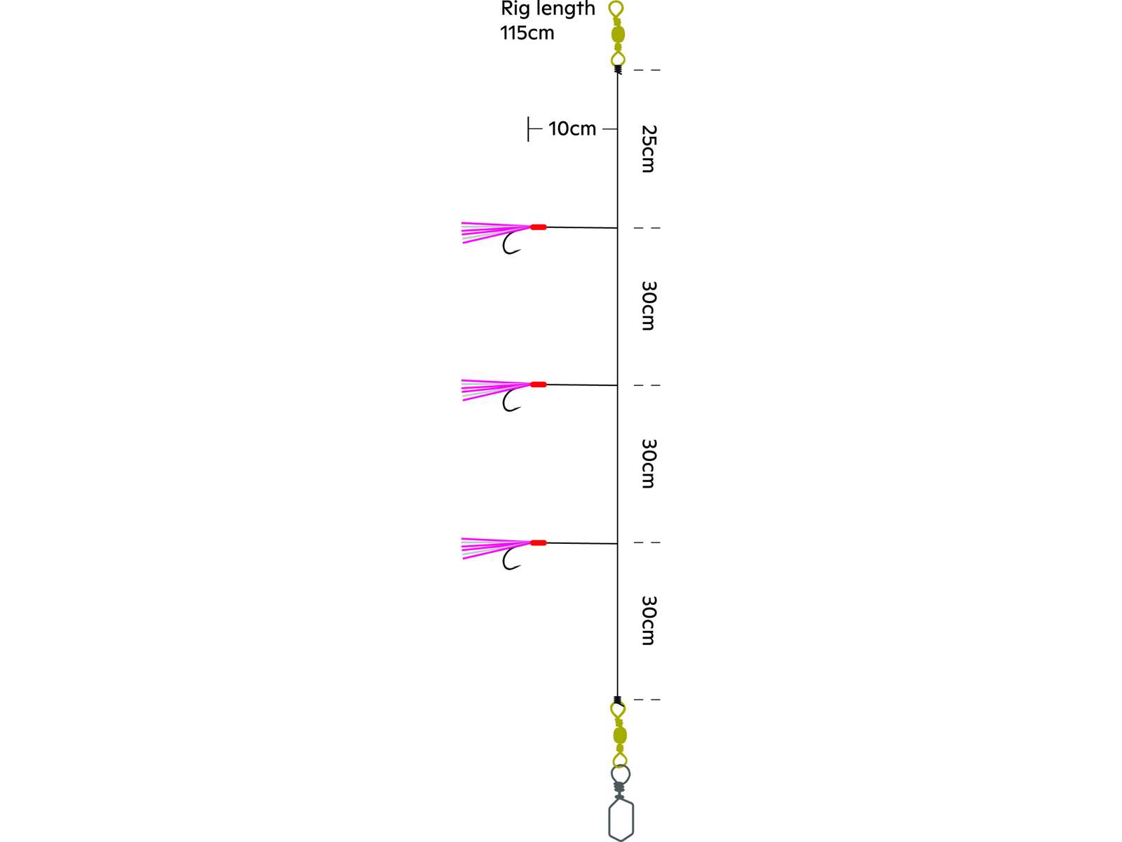 Tři středně velké háčky, vyzbrojené silnými monochromatickými a svůdnými zábleskovými vlasovými barvami, jsou pro většinu pelagických druhů.