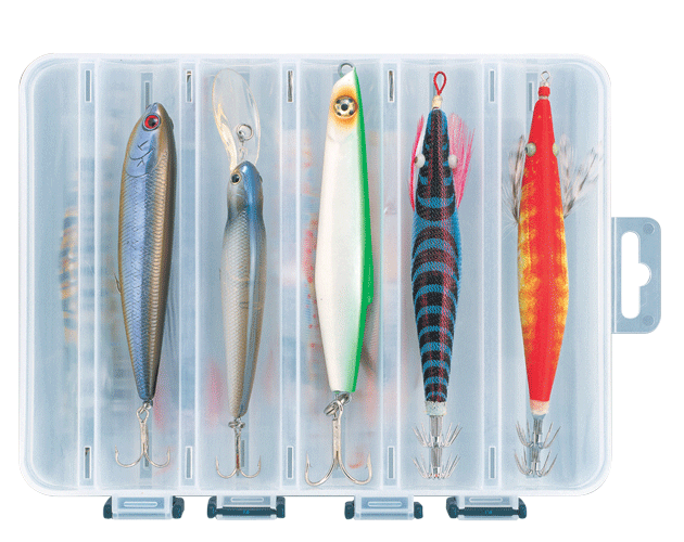 Jedinečné tvarování přihrádek dovolí uložení wobblerů a pilkrů z obou stran při minimální tloušťce krabičky.