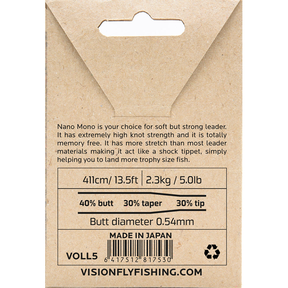 Pokud máte rádi měkké a silné návazce, Nano Mono je vaše volba. Má extrémně vysokou pevnost v uzlu a je zcela bez paměti. Má větší roztažnost než většina návazcových materiálů, díky čemuž se chová jako šokový a jednoduše vám pomůže zdolat více trofejní ryb.