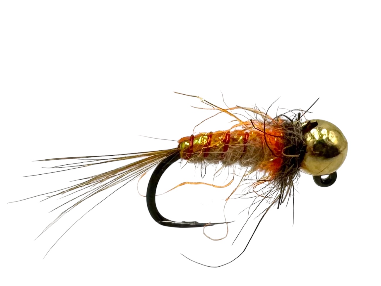 Tělo mušky je tvořeno jemným dubbingem s červeným žebrováním, které ve vodě vytváří jemné odlesky připomínající larvy hmyzu. Výrazný oranžový hotspot u hlavičky dodává mušce atraktivitu a láká i opatrné ryby. Díky zlaté wolframové hlavičce se muška rychle potápí a udržuje správnou hloubku i v rychlejším proudu. Její univerzální charakter z ní dělá perfektní volbu pro lov pstruhů, lipanů, tloušťů i jiných lososovitých ryb během celého roku.
