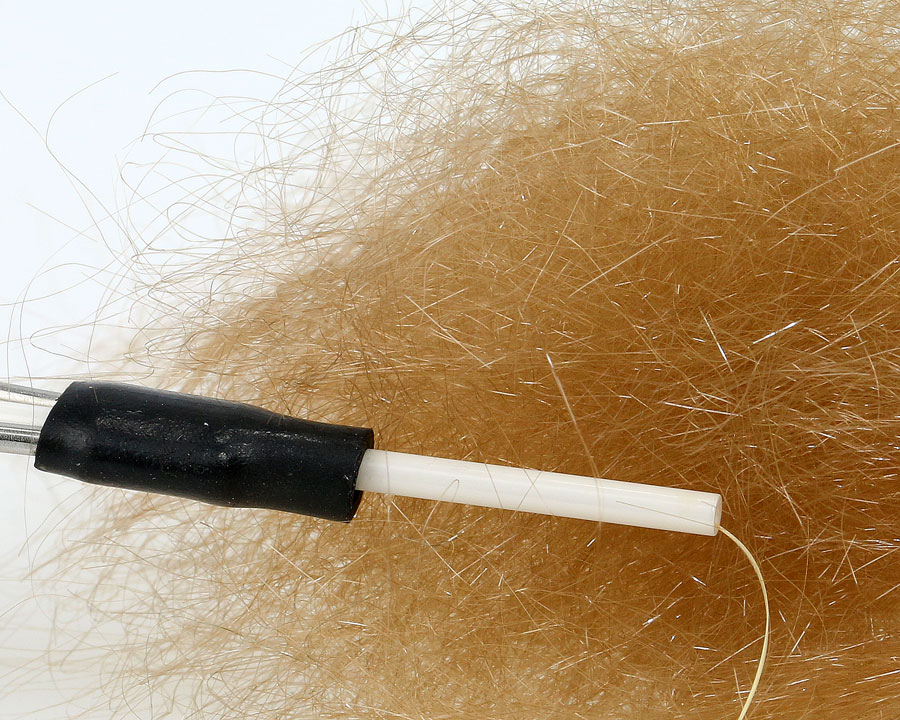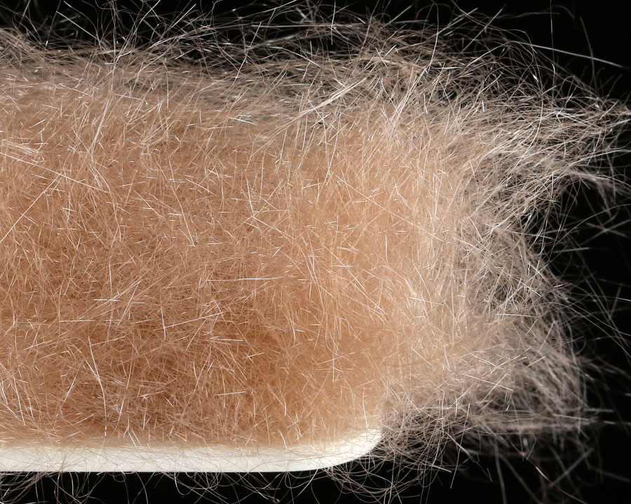 Jemný syntetický dubbing s dlouhými průsvitnými vlákny.