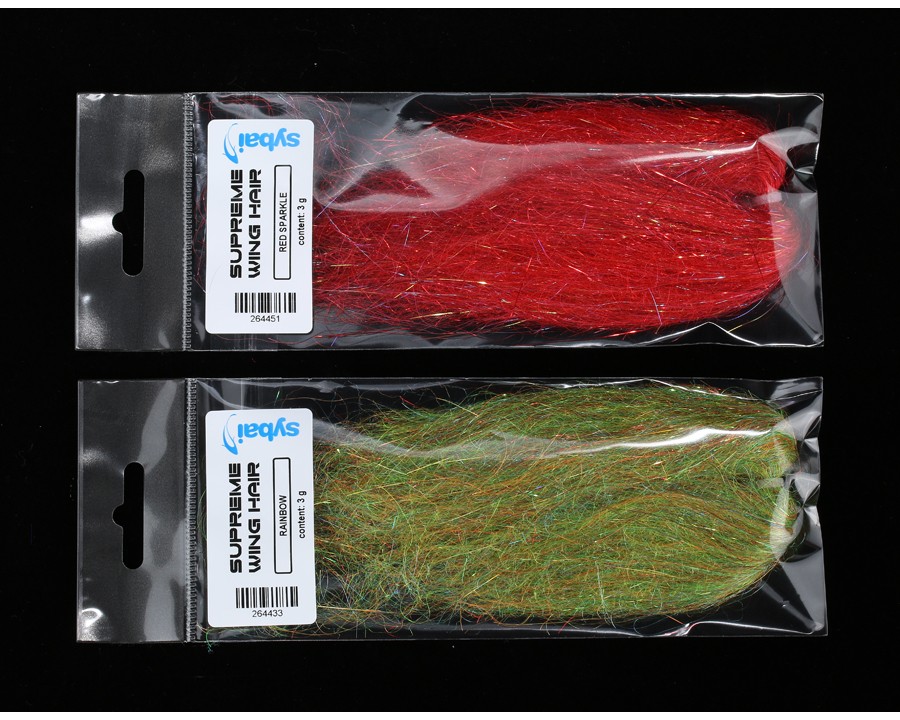 Supreme Wing Hair je syntetický vázací materiál, který lze použít různými způsoby. Vyvážená směs jemných vláken a tenkých pramenů s neholografickým třpytem (v různých barvách) je ideální pro výrobu streamrů, lososích trubičkových mušek a řady dalších vzorů. Zejména na tělíčka, ocásky, hlavičky a křídla můžeme tuto velmi produktivní směs materiálů doporučit. Díky široké škále barev máte u vázacího stolu nekonečné možnosti. A vzhledem k celkové délce vlákna můžete Supreme Wing Hair použít i na extra velké mušky.