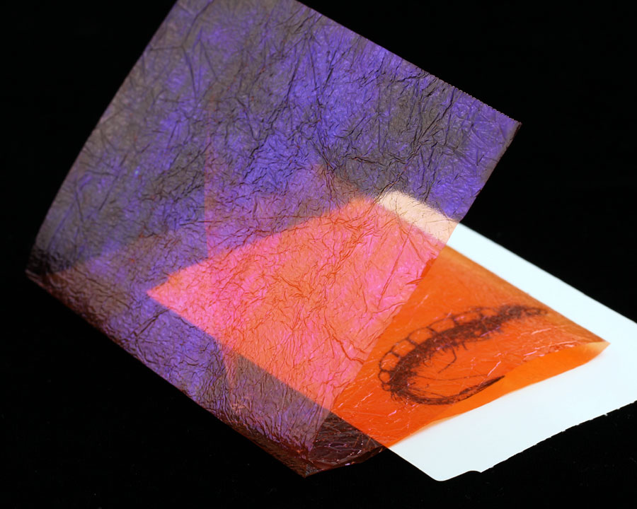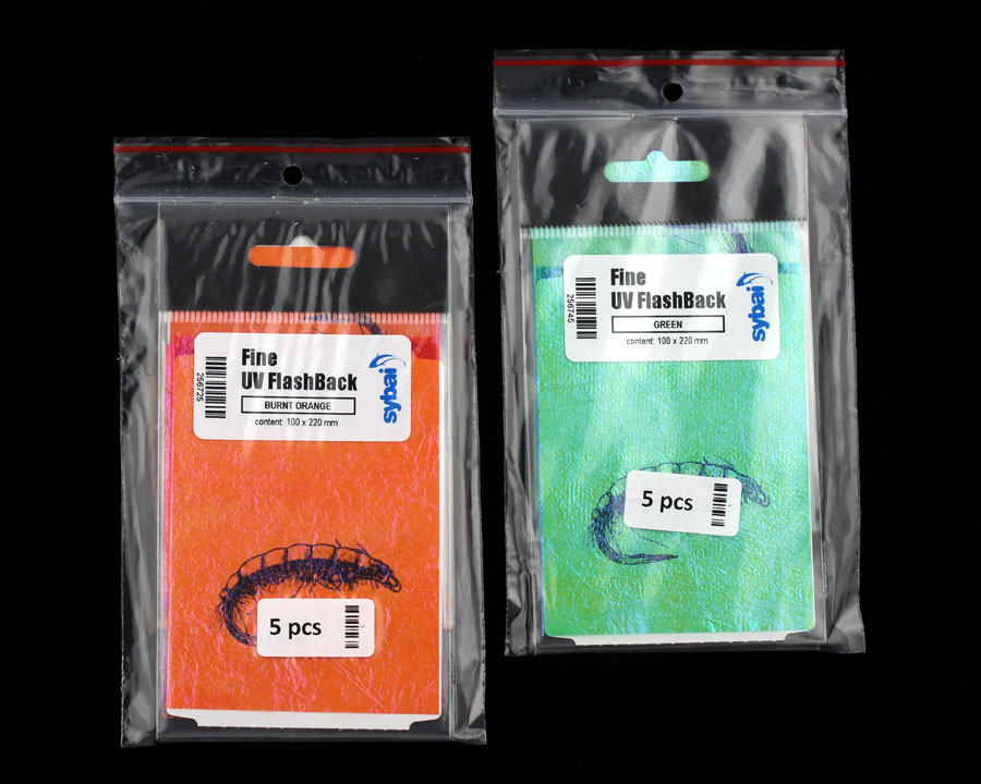 Velmi jemná fólie s UV iridiscentním leskem. Vynikající na hřbítky malých vzorů českých nymf, blešivců a pod.