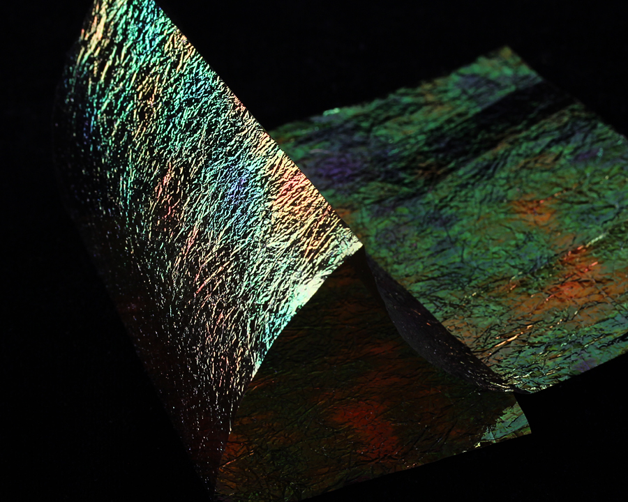 Velmi jemná fólie s iridiscentním leskem. Vynikající na hřbítky malých vzorů českých nymf, blešivců a pod.